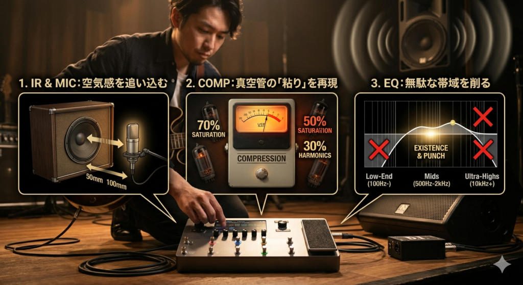 IRの調整は、ギターの指の感覚、すなわち「ピッキングした瞬間の音の立ち上がり(アタック)」を決定づける、極めて重要な作業です。